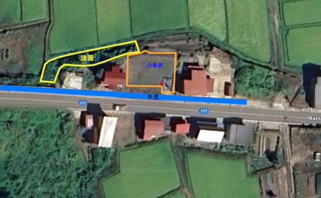 概ね「黄色で囲んだ急斜面(地目は山林 1筆)」と「オレンジ色で囲んだ土地(地目は田 3筆)」の両方を引き取ってくださる場合、無料で差し上げます。