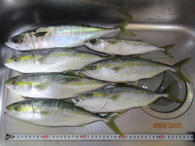 | 釣果は29〜32cmのワカシ5匹、25cmサバ1匹、35cmサバ1匹でした。 |