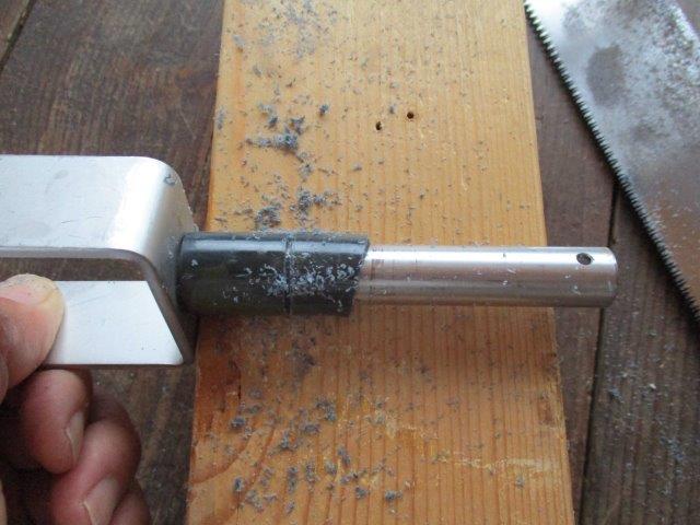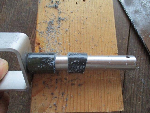 | 塩ビ管と思われるもので加工したこの部分、印をつけた右側が長すぎる(18ミリくらい)ために、Rピンを差し込む穴が出てこないのです。 |
